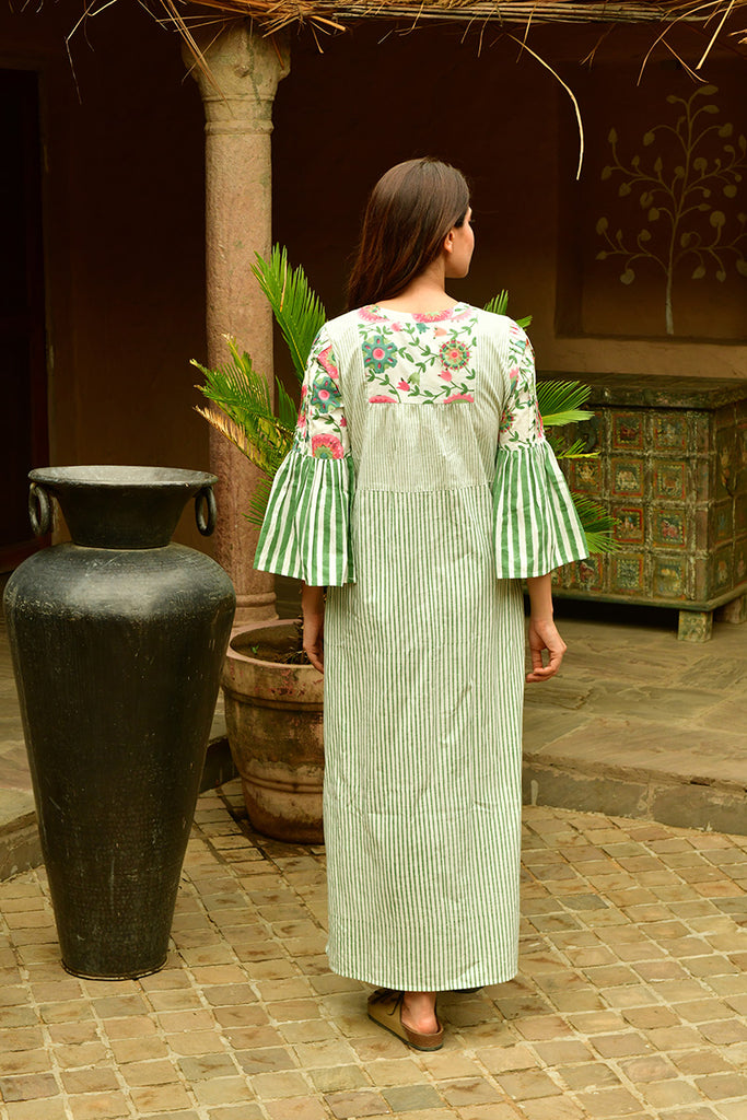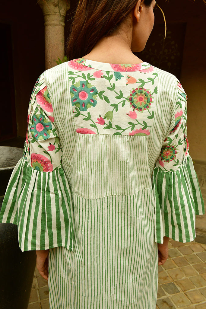 We love all things Suzani fabric and this season we've brought you a detailed pastel block print in the most perfect cocktails shape with contrasting striped flared sleeves and yolk detailing - this is the perfect occasion dress for all your summer entertaining dreams