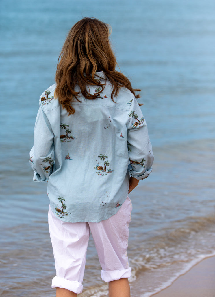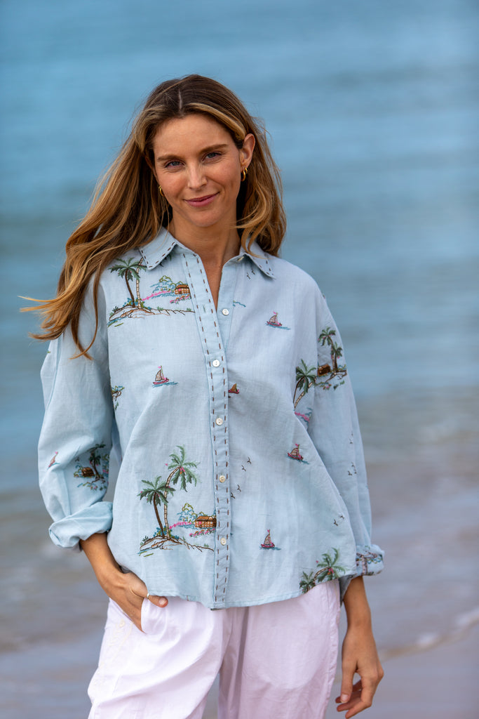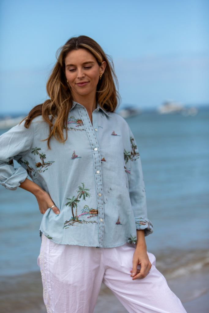 With delicate embroidery of beautiful vintage Hawaiian scenes and tropical islands, this print is the perfect timeless wardrobe staple