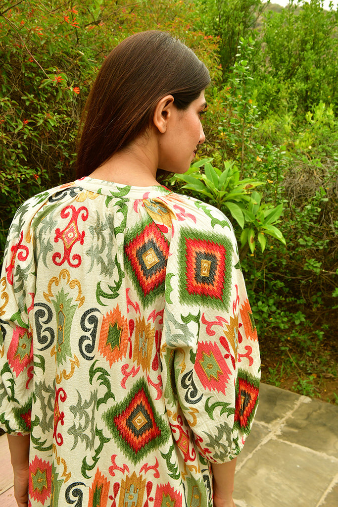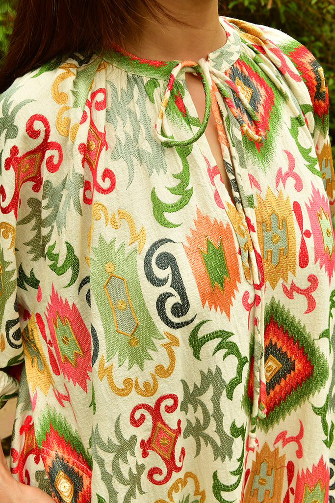 Our Mrs Kappor Maxi is an ode to all our favourite fabrics and colourful textures of India, with beautiful colours, an effortless free-flowing style and tie neck detailing