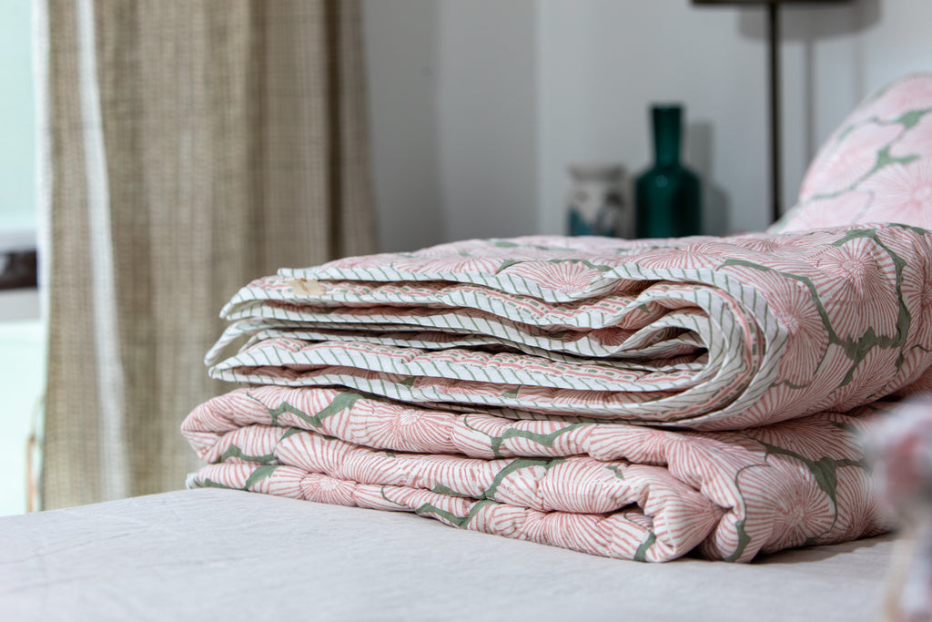 Contrasting the soft greens and pinks, these quilts are essentials for adding a subtle pop of colour to your bedroom